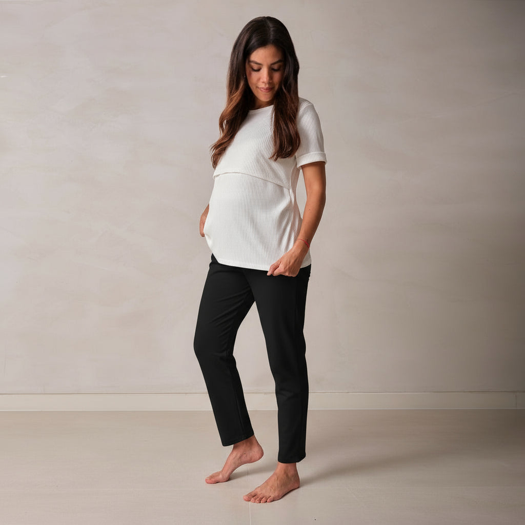 - Color: pantalón jogger materno azul oscuro y camiseta de lactancia blanca